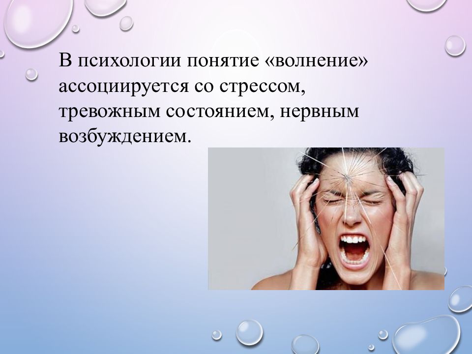 В психологии понятие «волнение» ассоциируется со стрессом, тревожным состоянием, нервным возбуждением.