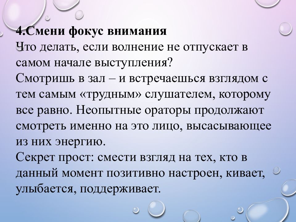 4.Смени фокус внимания Что делать, если волнение не отпускает в самом начале выступления? Смотришь в зал – и встречаешься взглядом с тем самым «трудным» слушателем, которому все равно. Неопытные ораторы продолжают смотреть именно на это лицо, высасывающее из них энергию. Секрет прост: смести взгляд на тех, кто в данный момент позитивно настроен, кивает, улыбается, поддерживает.