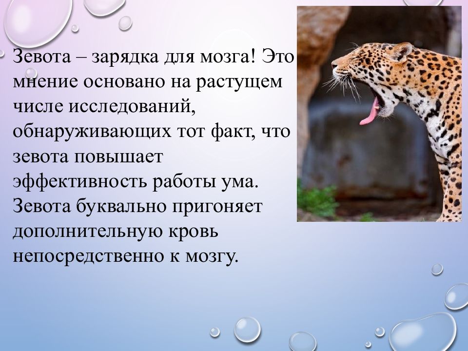 Зевота – зарядка для мозга! Это мнение основано на растущем числе исследований, обнаруживающих тот факт, что зевота повышает эффективность работы ума. Зевота буквально пригоняет дополнительную кровь непосредственно к мозгу.