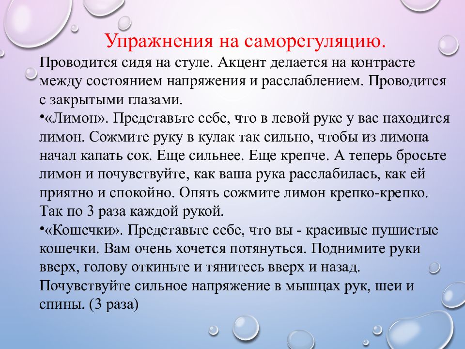 Упражнения на саморегуляцию. Проводится сидя на стуле. Акцент делается на контрасте между состоянием напряжения и расслаблением. Проводится с закрытыми глазами. «Лимон». Представьте себе, что в левой руке у вас находится лимон. Сожмите руку в кулак так сильно, чтобы из лимона начал капать сок. Еще сильнее. Еще крепче. А теперь бросьте лимон и почувствуйте, как ваша рука расслабилась, как ей приятно и спокойно. Опять сожмите лимон крепко-крепко. Так по 3 раза каждой рукой. «Кошечки». Представьте себе, что вы - красивые пушистые кошечки. Вам очень хочется потянуться. Поднимите руки вверх, голову откиньте и тянитесь вверх и назад. Почувствуйте сильное напряжение в мышцах рук, шеи и спины. (3 раза)