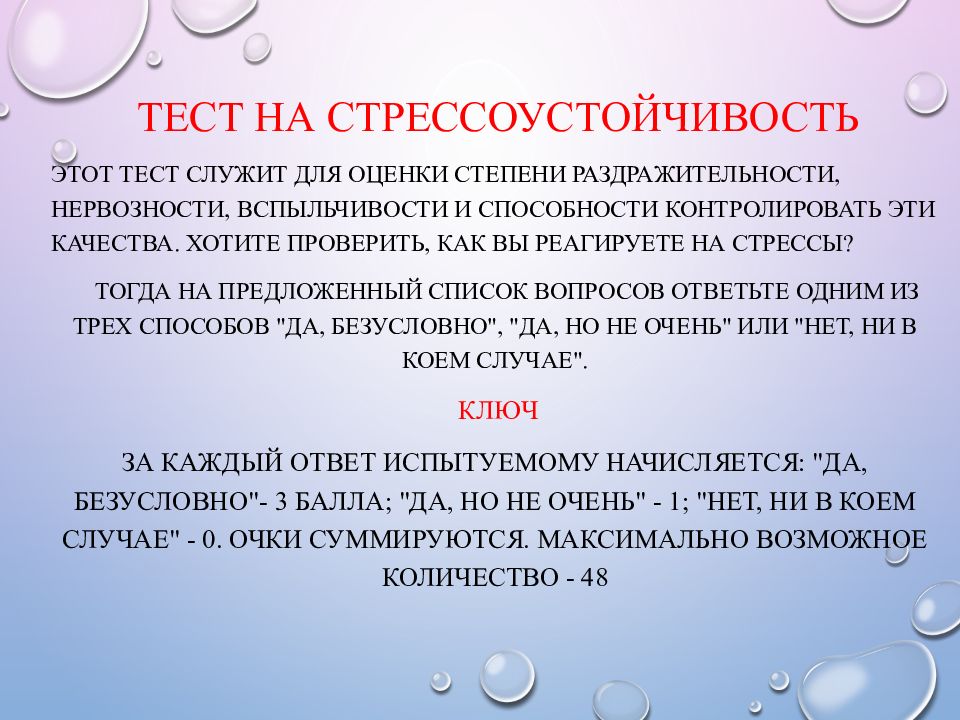 ТЕСТ НА СТРЕССОУСТОЙЧИВОСТЬ Этот тест служит для оценки степени раздражительности, нервозности, вспыльчивости и способности контролировать эти качества. Хотите проверить, как Вы реагируете на стрессы? Тогда на предложенный список вопросов ответьте одним из трех способов " да, безусловно", "да, но не очень" или "нет, ни в коем случае ". Ключ За каждый ответ испытуемому начисляется: "да, безусловно"- 3 балла; "да, но не очень" - 1; "нет, ни в коем случае" - 0. Очки суммируются. Максимально возможное количество - 48