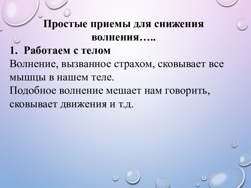 Простые приемы для снижения волнения….. Работаем с телом Волнение, вызванное страхом, сковывает все мышцы в нашем теле. Подобное волнение мешает нам говорить, сковывает движения и т.д.