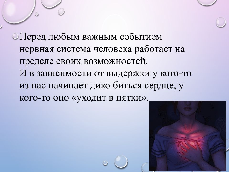 Перед любым важным событием нервная система человека работает на пределе своих возможностей. И в зависимости от выдержки у кого-то из нас начинает дико биться сердце, у кого-то оно «уходит в пятки ».