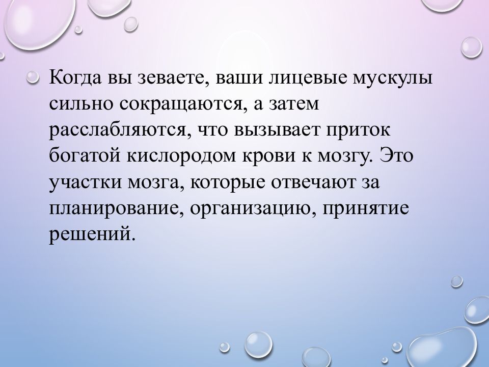 Когда вы зеваете, ваши лицевые мускулы сильно сокращаются, а затем расслабляются, что вызывает приток богатой кислородом крови к мозгу. Это участки мозга, которые отвечают за планирование, организацию, принятие решений.