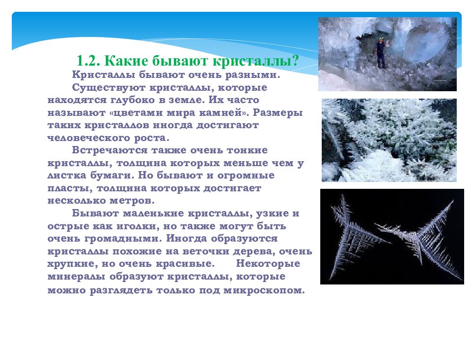 1. 2. Какие бывают кристаллы? Кристаллы бывают очень разными. Существуют кристаллы, которые находятся глубоко в земле. Их часто называют «цветами мира камней». Размеры таких кристаллов иногда достигают человеческого роста. Встречаются также очень тонкие кристаллы, толщина которых меньше чем у листка бумаги. Но бывают и огромные пласты, толщина которых достигает несколько метров. Бывают маленькие кристаллы, узкие и острые как иголки, но также могут быть очень громадными. Иногда образуются кристаллы похожие на веточки дерева, очень хрупкие, но очень красивые. Некоторые минералы образуют кристаллы, которые можно разглядеть только под микроскопом.