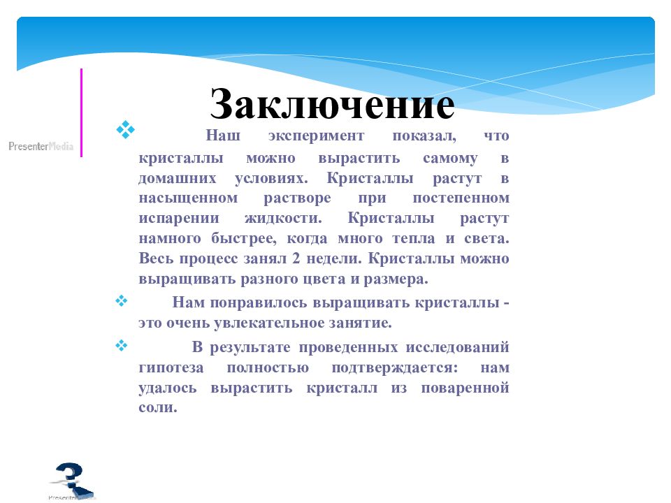 Заключение Наш эксперимент показал, что кристаллы можно вырастить самому в домашних условиях. Кристаллы растут в насыщенном растворе при постепенном испарении жидкости. Кристаллы растут намного быстрее, когда много тепла и света. Весь процесс занял 2 недели. Кристаллы можно выращивать разного цвета и размера. Нам понравилось выращивать кристаллы - это очень увлекательное занятие. В результате проведенных исследований гипотеза полностью подтверждается: нам удалось вырастить кристалл из поваренной соли.