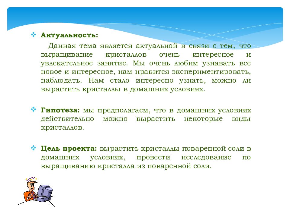 Актуальность: Данная тема является актуальной в связи с тем, что выращивание кристаллов очень интересное и увлекательное занятие. Мы очень любим узнавать все новое и интересное, нам нравится экспериментировать, наблюдать. Нам стало интересно узнать, можно ли вырастить кристаллы в домашних условиях. Гипотеза: мы предполагаем, что в домашних условиях действительно можно вырастить некоторые виды кристаллов. Цель проекта: вырастить кристаллы поваренной соли в домашних условиях, провести исследование по выращиванию кристалла из поваренной соли.