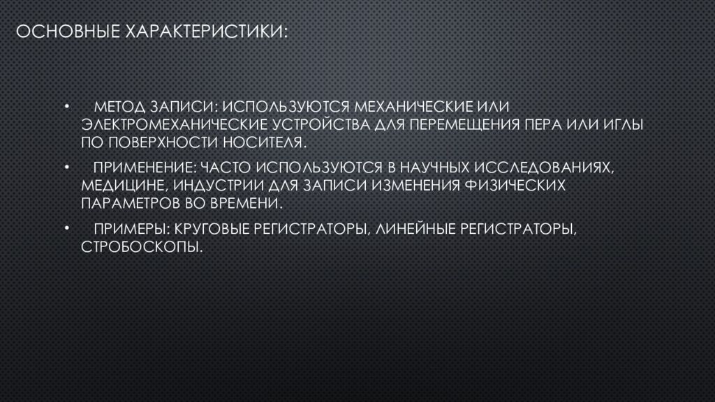 Метод записи: Используются механические или электромеханические устройства для перемещения пера или иглы по поверхности носителя. Применение: Часто используются в научных исследованиях, медицине, индустрии для записи изменения физических параметров во времени. Примеры: Круговые регистраторы, линейные регистраторы, стробоскопы.