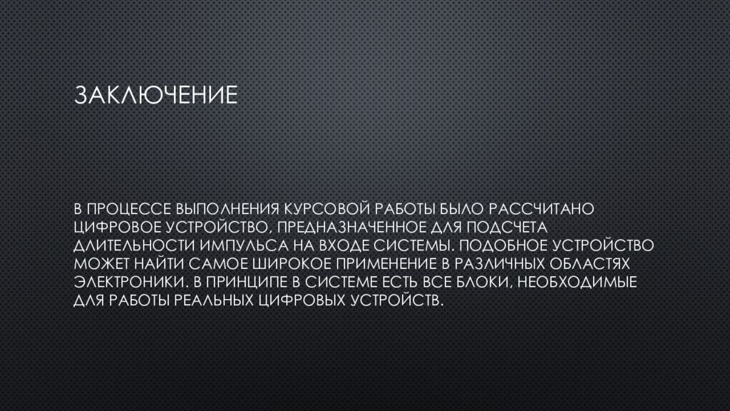 В процессе выполнения курсовой работы было рассчитано цифровое устройство, предназначенное для подсчета длительности импульса на входе системы. Подобное устройство может найти самое широкое применение в различных областях электроники. В принципе в системе есть все блоки, необходимые для работы реальных цифровых устройств.