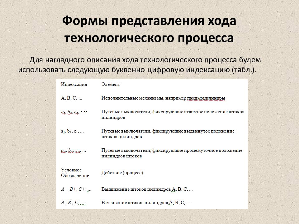 Для наглядного описания хода технологического процесса будем использовать следующую буквенно-цифровую индексацию (табл.).
