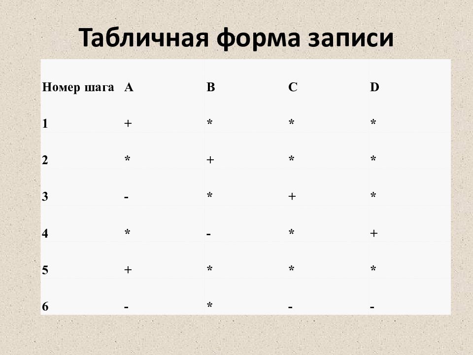 Номер шага А В С D 1 + * * * 2 * + * * 3 - * + * 4 * - * + 5 + * * * 6 - * - -