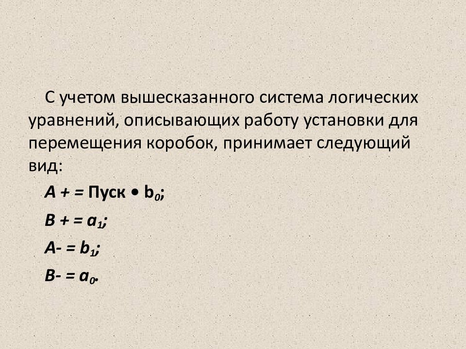 Слайд 23: Система логических уравнений, описывающая работу устройства для перемещения коробок, в конечном итоге будет иметь следующий вид: