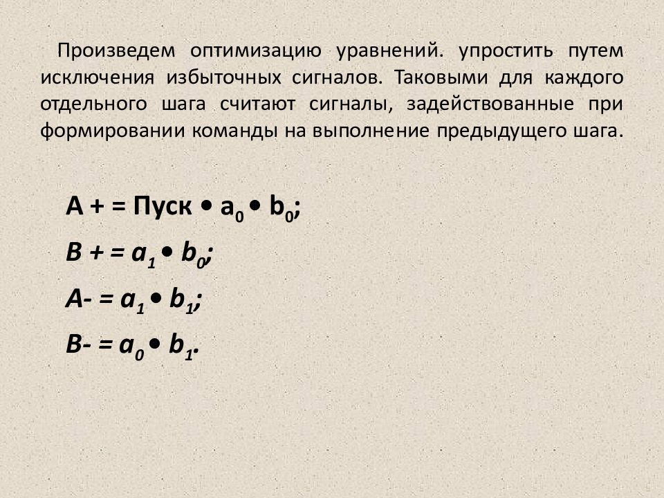 Слайд 25: Произведем оптимизацию уравнений. упростить путем исключения избыточных сигналов. Таковыми для каждого отдельного шага считают сигналы, задействованные при формировании команды на выполнение предыдущего шага