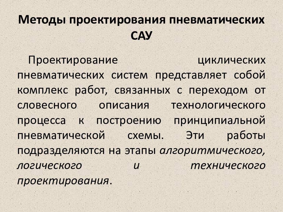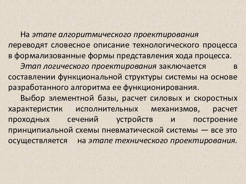 На этапе алгоритмического проектирования п ереводят словесное описание технологического процесса в формализованные формы представления хода процесса. Этап логического проектирования заключается в составлении функциональной структуры системы на основе разработанного алгоритма ее функционирования. Выбор элементной базы, расчет силовых и скоростных характеристик исполнительных механизмов, расчет проходных сечений устройств и построение принципиальной схемы пневматической системы — все это осуществляется на этапе технического проектирования.