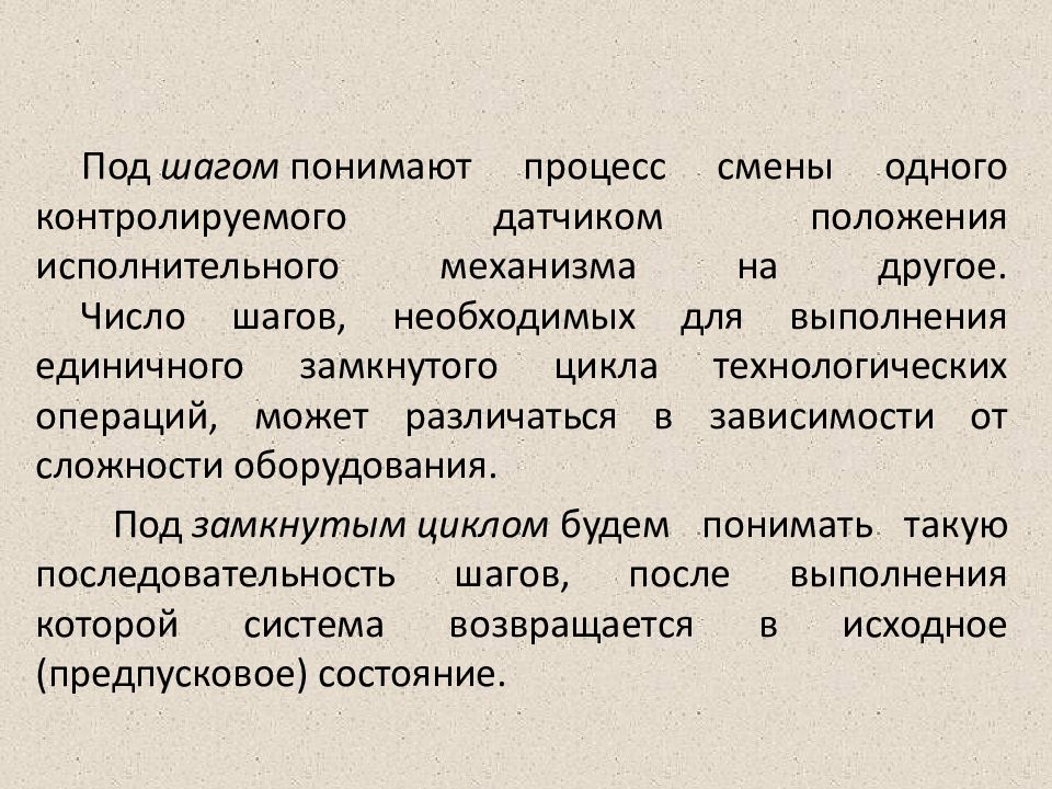 Под шагом понимают процесс смены одного контролируемого датчиком положения исполнительного механизма на другое. Число шагов, необходимых для выполнения единичного замкнутого цикла технологических операций, может различаться в зависимости от сложности оборудования. Под замкнутым циклом будем понимать такую последовательность шагов, после выполнения которой система возвращается в исходное (предпусковое) состояние.