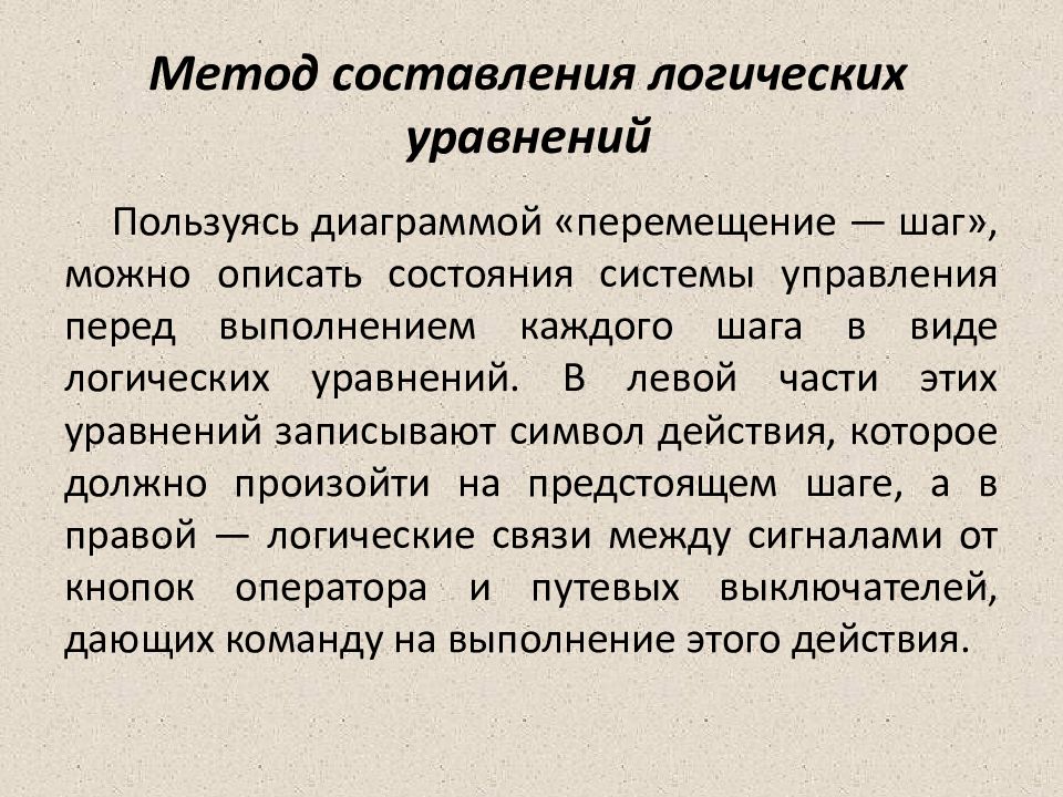 Пользуясь диаграммой «перемещение — шаг», можно описать состояния системы управления перед выполнением каждого шага в виде логических уравнений. В левой части этих уравнений записывают символ действия, которое должно произойти на предстоящем шаге, а в правой — логические связи между сигналами от кнопок оператора и путевых выключателей, дающих команду на выполнение этого действия.