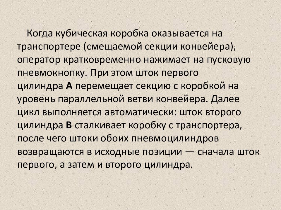 Когда кубическая коробка оказывается на транспортере (смещаемой секции конвейера), оператор кратковременно нажимает на пусковую пневмокнопку. При этом шток первого цилиндра А перемещает секцию с коробкой на уровень параллельной ветви конвейера. Далее цикл выполняется автоматически: шток второго цилиндра В сталкивает коробку с транспортера, после чего штоки обоих пневмоцилиндров возвращаются в исходные позиции — сначала шток первого, а затем и второго цилиндра.
