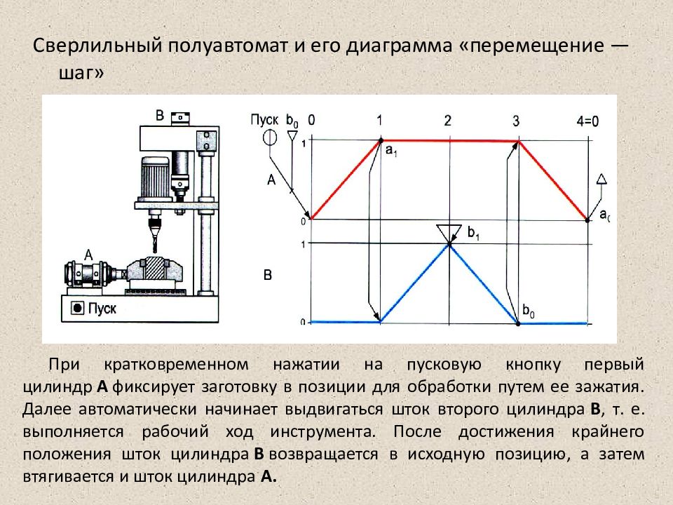 Сверлильный полуавтомат и его диаграмма «перемещение — шаг» При кратковременном нажатии на пусковую кнопку первый цилиндр А фиксирует заготовку в позиции для обработки путем ее зажатия. Далее автоматически начинает выдвигаться шток второго цилиндра В, т. е. выполняется рабочий ход инструмента. После достижения крайнего положения шток цилиндра В возвращается в исходную позицию, а затем втягивается и шток цилиндра А.