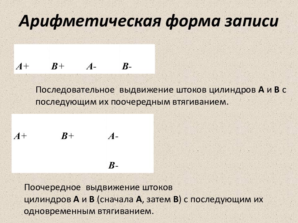 А + В + А - В - А + В + А - В - Поочередное выдвижение штоков цилиндров А и В (сначала А, затем В ) с последующим их одновременным втягиванием. Последовательное выдвижение штоков цилиндров А и В с последующим их поочередным втягиванием.