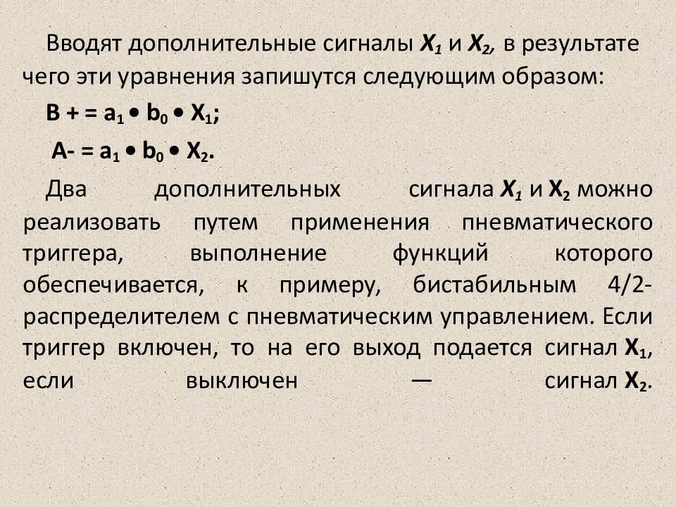 Вводят дополнительные сигналы Х 1 и Х 2, в результате чего эти уравнения запишутся следующим образом: В + = а 1 • b 0 • Х 1 ; A- = а 1 • b 0 • Х 2. Два дополнительных сигнала Х 1 и Х 2 можно реализовать путем применения пневматического триггера, выполнение функций которого обеспечивается, к примеру, бистабильным 4/2-распределителем с пневматическим управлением. Если триггер включен, то на его выход подается сигнал X 1, если выключен — сигнал Х 2.
