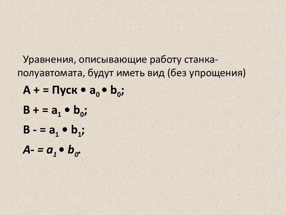 Уравнения, описывающие работу станка-полуавтомата, будут иметь вид (без упрощения) A + = Пуск • а 0 • b 0 ; B + = а 1 • b 0 ; B - = а 1 • b 1 ; А- = a 1 • b 0.