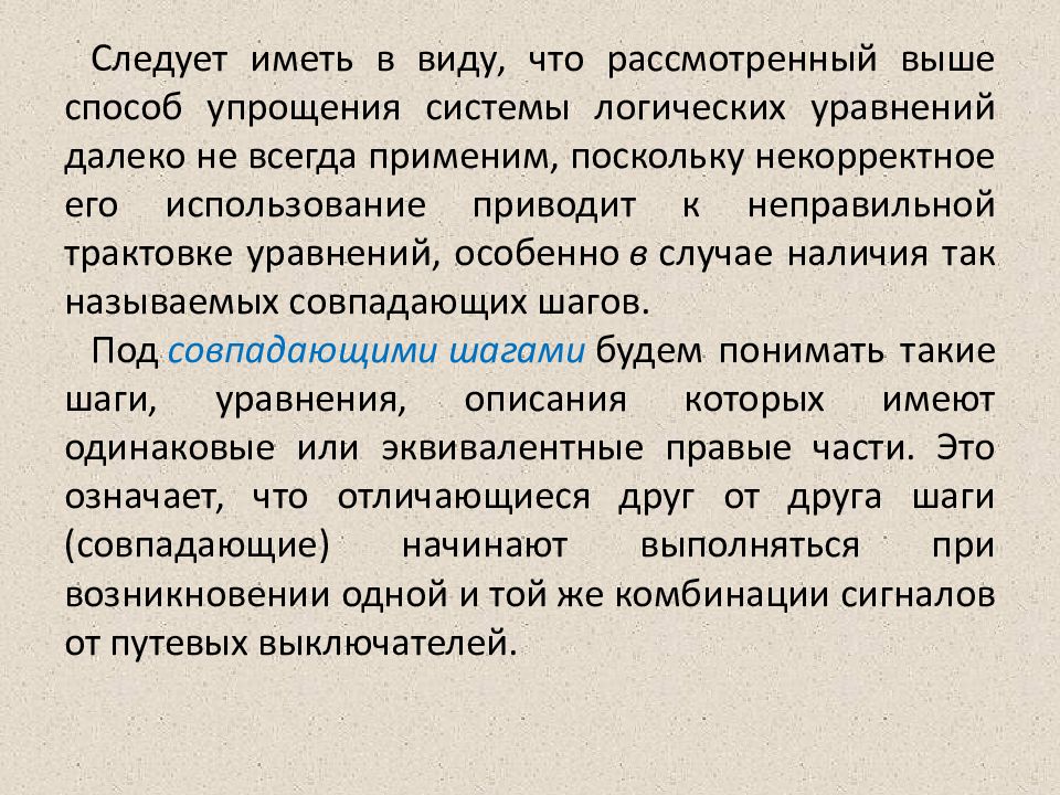 Следует иметь в виду, что рассмотренный выше способ упрощения системы логических уравнений далеко не всегда применим, поскольку некорректное его использование приводит к неправильной трактовке уравнений, особенно в случае наличия так называемых совпадающих шагов. Под совпадающими шагами будем понимать такие шаги, уравнения, описания которых имеют одинаковые или эквивалентные правые части. Это означает, что отличающиеся друг от друга шаги (совпадающие) начинают выполняться при возникновении одной и той же комбинации сигналов от путевых выключателей.