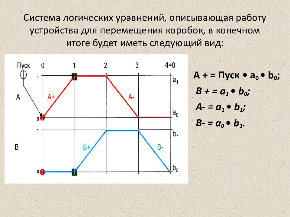 С учетом вышесказанного система логических уравнений, описывающих работу установки для перемещения коробок, принимает следующий вид: А + = Пуск • b 0 ; В + = а 1 ; А- = b 1 ; В- = а 0.
