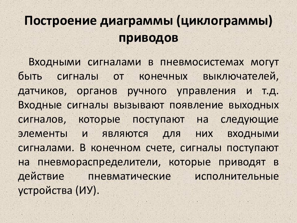 Входными сигналами в пневмосистемах могут быть сигналы от конечных выключателей, датчиков, органов ручного управления и т.д. Входные сигналы вызывают появление выходных сигналов, которые поступают на следующие элементы и являются для них входными сигналами. В конечном счете, сигналы поступают на пневмораспределители, которые приводят в действие пневматические исполнительные устройства (ИУ).