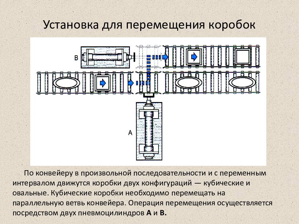 По конвейеру в произвольной последовательности и с переменным интервалом движутся коробки двух конфигураций — кубические и овальные. Кубические коробки необходимо перемещать на параллельную ветвь конвейера. Операция перемещения осуществляется посредством двух пневмоцилиндров А и В.