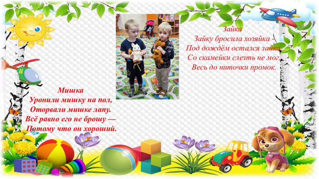 Зайка Зайку бросила хозяйка - Под дождём остался зайка. Со скамейки слезть не мог, Весь до ниточки промок. Мишка Уронили мишку на пол, Оторвали мишке лапу. Всё равно его не брошу — Потому что он хороший.