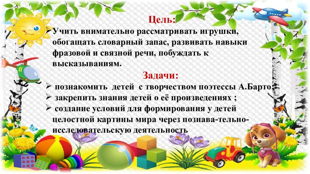 Цель: Учить внимательно рассматривать игрушки, обогащать словарный запас, развивать навыки фразовой и связной речи, побуждать к высказываниям. Задачи: познакомить детей с творчеством поэтессы А.Барто ; закрепить знания детей о её произведениях ; создание условий для формирования у детей целостной картины мира через познава - тельно -исследовательскую деятельность