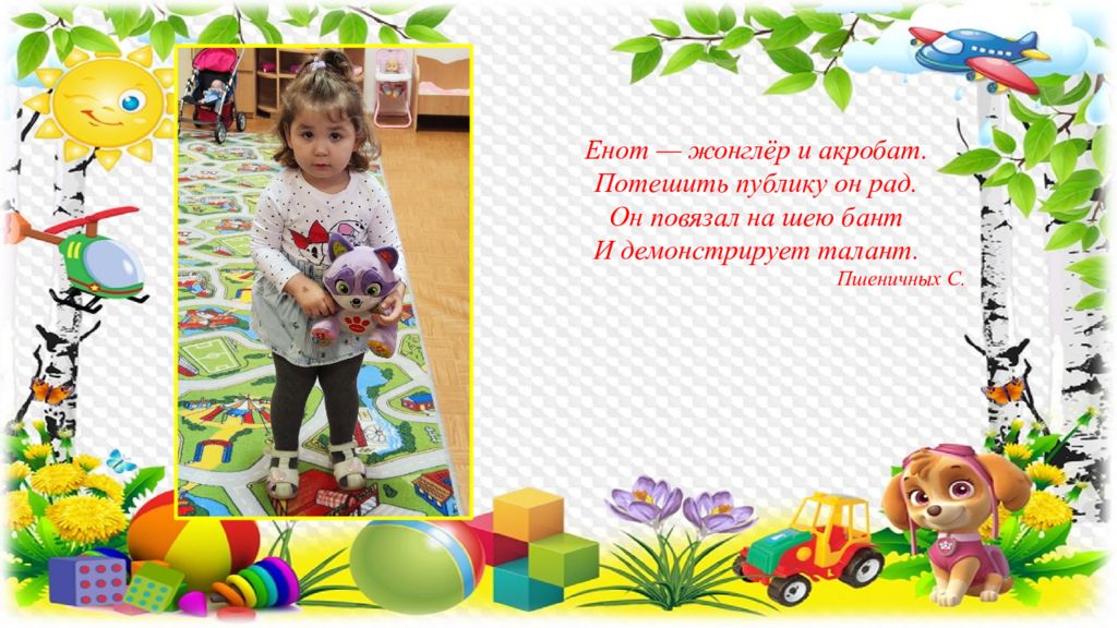 Енот — жонглёр и акробат. Потешить публику он рад. Он повязал на шею бант И демонстрирует талант. Пшеничных С.