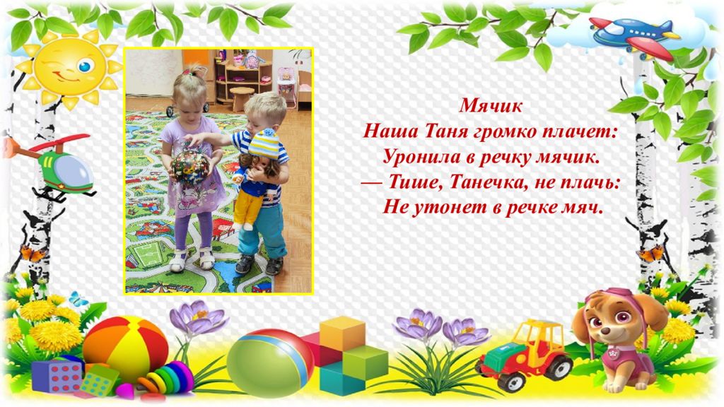 Мячик Наша Таня громко плачет: Уронила в речку мячик. — Тише, Танечка, не плачь: Не утонет в речке мяч.