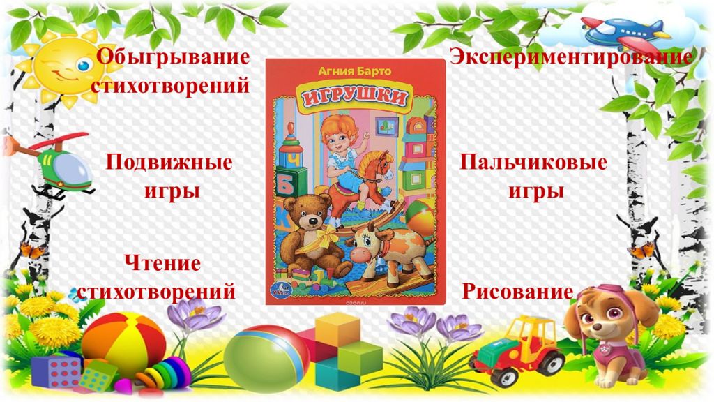 Обыгрывание стихотворений Чтение стихотворений Экспериментирование Рисование Подвижные игры Пальчиковые игры