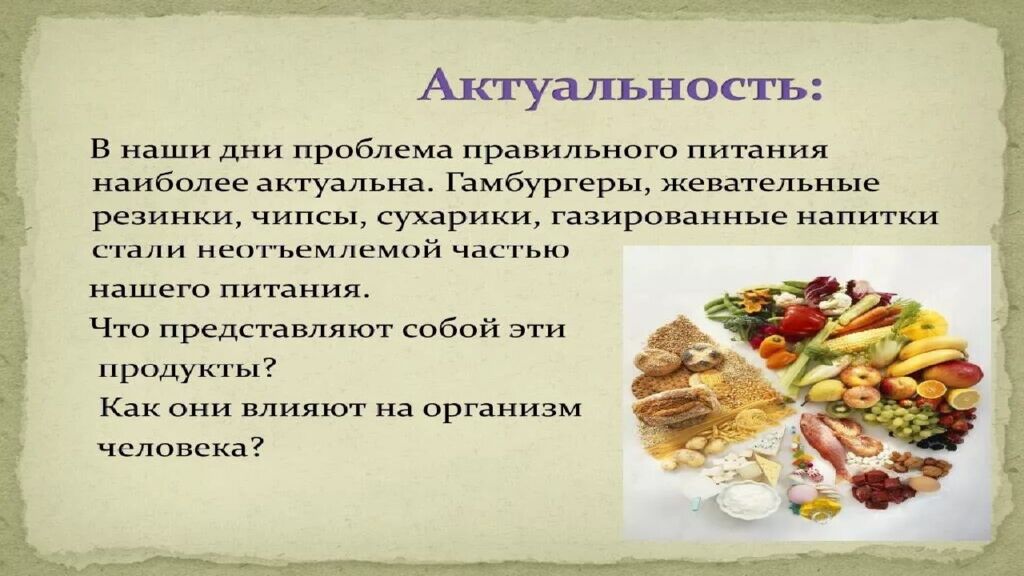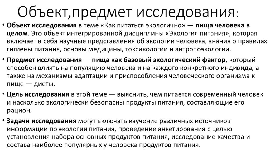 Объект исследования в теме «Как питаться экологично » — пища человека в целом. Это объект интегрированной дисциплины «Экология питания», которая включает в себя научные представления об экологии человека, знания о правилах гигиены питания, основы медицины, токсикологии и антропоэкологии. Предмет исследования — пища как базовый экологический фактор, который способен влиять на популяцию человека и на каждого конкретного индивида, а также на механизмы адаптации и приспособления человеческого организма к пище — диеты. Цель исследования в этой теме — выяснить, чем питается современный человек и насколько экологически безопасны продукты питания, составляющие его рацион. Задачи исследования могут включать изучение различных источников информации по экологии питания, проведение анкетирования с целью установления набора основных продуктов питания, исследование качества и состава наиболее популярных у человека продуктов питания.