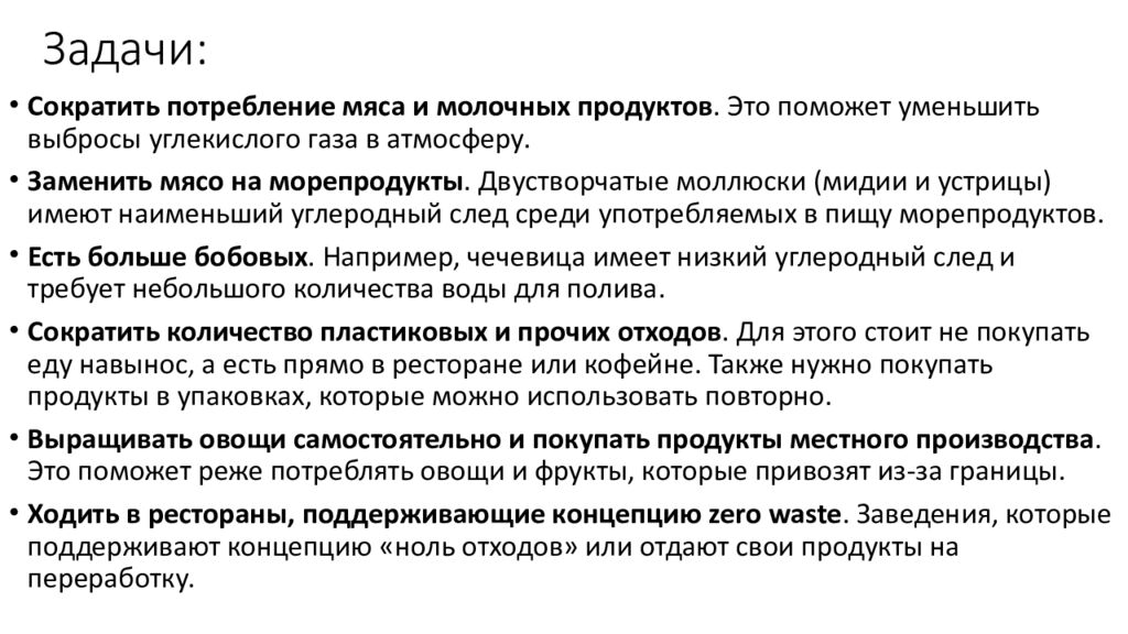 Сократить потребление мяса и молочных продуктов. Это поможет уменьшить выбросы углекислого газа в атмосферу. Заменить мясо на морепродукты. Двустворчатые моллюски (мидии и устрицы) имеют наименьший углеродный след среди употребляемых в пищу морепродуктов. Есть больше бобовых. Например, чечевица имеет низкий углеродный след и требует небольшого количества воды для полива. Сократить количество пластиковых и прочих отходов. Для этого стоит не покупать еду навынос, а есть прямо в ресторане или кофейне. Также нужно покупать продукты в упаковках, которые можно использовать повторно. Выращивать овощи самостоятельно и покупать продукты местного производства. Это поможет реже потреблять овощи и фрукты, которые привозят из-за границы. Ходить в рестораны, поддерживающие концепцию zero waste. Заведения, которые поддерживают концепцию «ноль отходов» или отдают свои продукты на переработку.