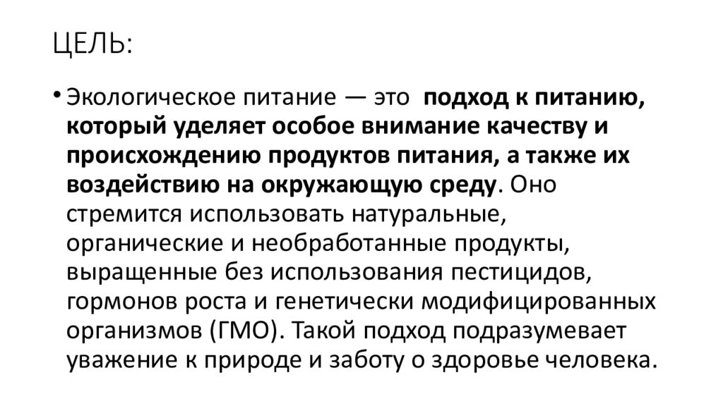 Экологическое питание — это подход к питанию, который уделяет особое внимание качеству и происхождению продуктов питания, а также их воздействию на окружающую среду. Оно стремится использовать натуральные, органические и необработанные продукты, выращенные без использования пестицидов, гормонов роста и генетически модифицированных организмов (ГМО). Такой подход подразумевает уважение к природе и заботу о здоровье человека.