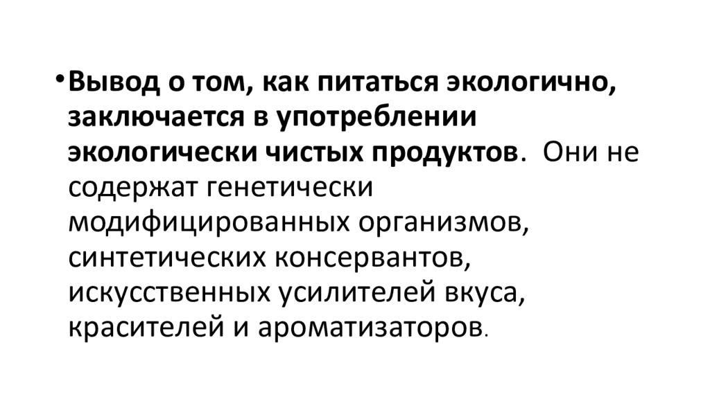 Вывод о том, как питаться экологично, заключается в употреблении экологически чистых продуктов. Они не содержат генетически модифицированных организмов, синтетических консервантов, искусственных усилителей вкуса, красителей и ароматизаторов.