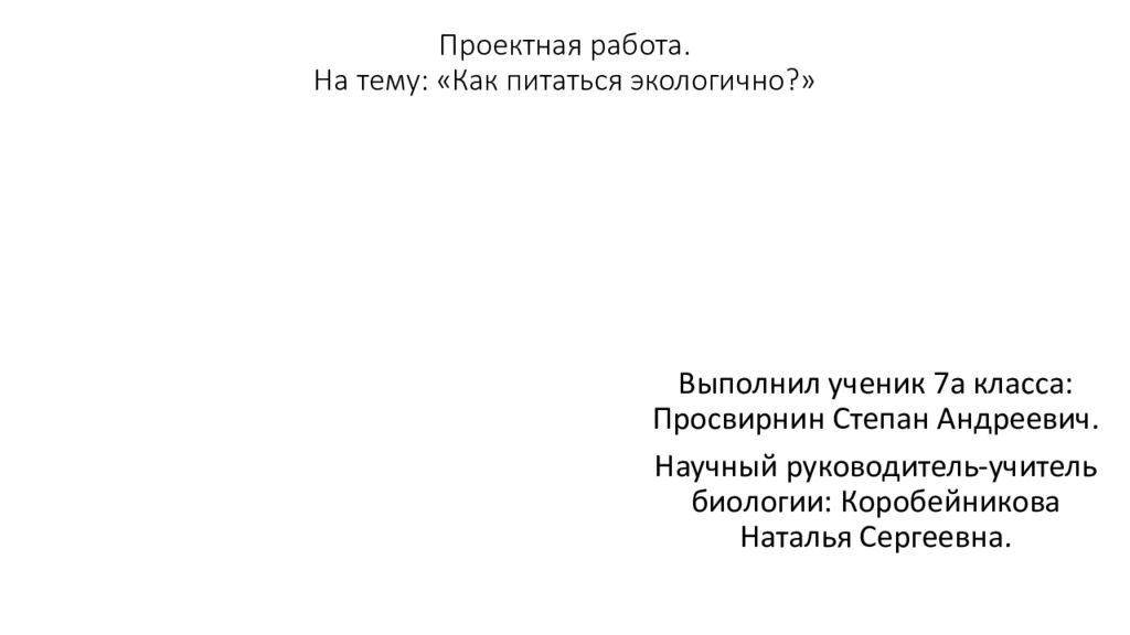 Последний слайд презентации: Проектная работа. На тему: «Как питаться экологично ?»