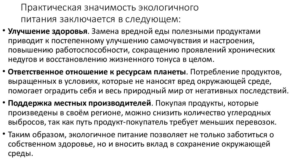Улучшение здоровья. Замена вредной еды полезными продуктами приводит к постепенному улучшению самочувствия и настроения, повышению работоспособности, сокращению проявлений хронических недугов и восстановлению жизненного тонуса в целом. Ответственное отношение к ресурсам планеты. Потребление продуктов, выращенных в условиях, которые не наносят вред окружающей среде, помогает оградить себя и весь природный мир от негативных последствий. Поддержка местных производителей. Покупая продукты, которые произведены в своём регионе, можно снизить количество углеродных выбросов, так как путь продукт-покупатель требует меньших перевозок. Таким образом, экологичное питание позволяет не только заботиться о собственном здоровье, но и вносить вклад в сохранение окружающей среды.