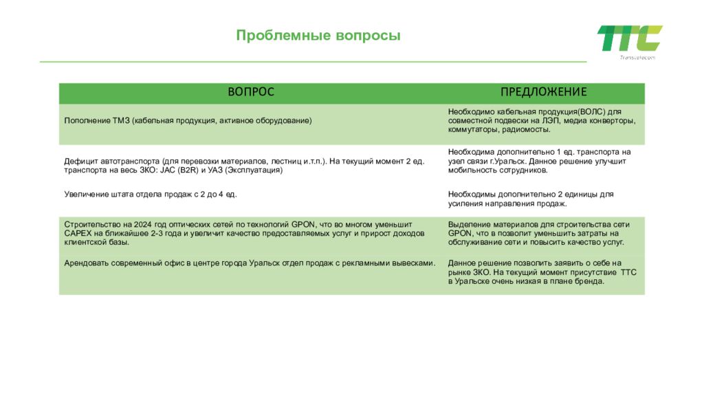 Проблемные вопросы ВОПРОС ПРЕДЛОЖЕНИЕ Пополнение ТМЗ (кабельная продукция, активное оборудование) Необходимо кабельная продукция(ВОЛС) для совместной подвески на ЛЭП, медиа конверторы, коммутаторы, радиомосты. Дефицит а втотранспорта (для перевозки материалов, лестниц и.т.п.). На текущий момент 2 ед. транспорта на весь ЗКО: JAC ( B2R) и УАЗ (Эксплуатация) Необходима дополнительно 1 ед. транспорта на узел связи г.Уральск. Данное решение улучшит мобильность сотрудников. Увеличение штата отдела продаж с 2 до 4 ед. Необходимы дополнительно 2 единицы для усиления направления продаж. Строительство на 2024 год оптических сетей по технологий GPON, что во многом уменьшит CAPEX на ближайшее 2-3 года и увеличит качество предоставляемых услуг и прирост доходов клиентской базы. Выделение материалов для строительства сети GPON, что в позволит у меньшить затраты на обслуживание сети и повысить качество услуг. Арендовать современный офис в центре города Уральск отдел продаж с рекламными вывесками. Данное решение позволить заявить о себе на рынке ЗКО. На текущий момент присутствие ТТС в Уральске очень низкая в плане бренда.