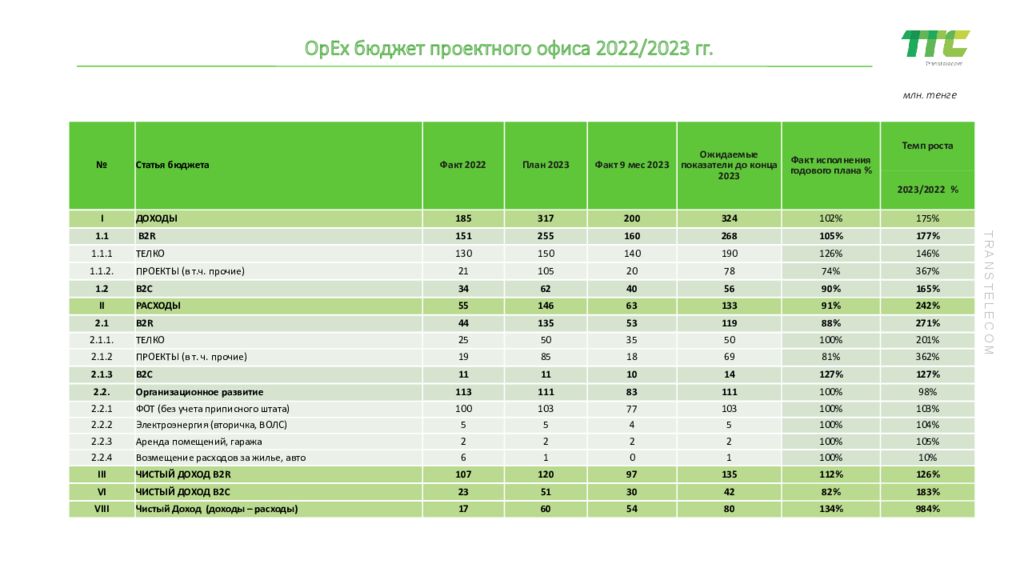 T R A N S T E L E C O M OpEx бюджет проектного офиса 2022/2023 гг. млн. тенге № Статья бюджета Факт 2022 План 2023 Факт 9 мес 2023 Ожидаемые показатели до конца 2023 Факт исполнения годового плана % Темп роста 2023/2022 % I ДОХОДЫ 185 317 200 324 102% 175% 1.1 B2R 151 255 160 268 105% 177% 1.1.1 ТЕЛКО 130 150 140 190 126% 146% 1.1.2. ПРОЕКТЫ (в т.ч. прочие) 21 105 20 78 74% 367% 1.2 B2 С 34 62 40 56 90% 165% II РАСХОДЫ 55 146 63 133 91% 242% 2.1 B2R 44 135 53 119 88% 271% 2.1.1. ТЕЛКО 25 50 35 50 100% 201% 2.1.2 ПРОЕКТЫ (в т. ч. прочие) 19 85 18 69 81% 362% 2.1.3 B2 С 11 11 10 14 127% 127% 2.2. Организационное развитие 113 111 83 111 100% 98% 2.2.1 ФОТ (без учета приписного штата) 100 103 77 103 100% 103% 2.2.2 Электроэнергия (вторичка, ВОЛС) 5 5 4 5 100% 104% 2.2.3 Аренда помещений, гаража 2 2 2 2 100% 105% 2.2.4 Возмещение расходов за жилье, авто 6 1 0 1 100% 10% III ЧИСТЫЙ ДОХОД B2R 107 120 97 135 112% 126% VI ЧИСТЫЙ ДОХОД B2 С 23 51 30 42 82% 183% VIII Чистый Доход (доходы – расходы) 17 60 54 80 134% 984%