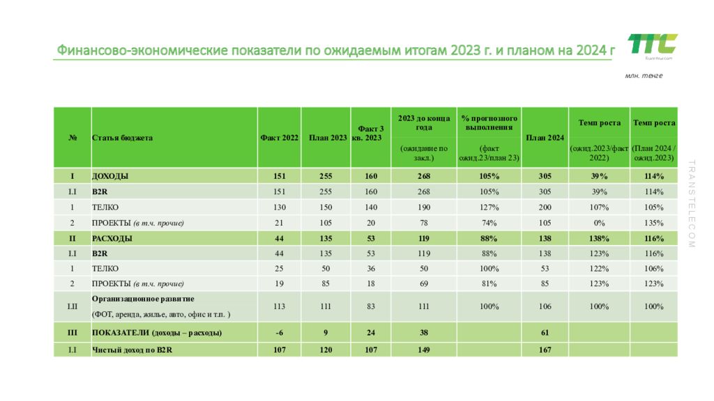 T R A N S T E L E C O M Финансово-экономические показатели по ожидаемым итогам 2023 г. и планом на 2024 г млн. тенге № Статья бюджета Факт 2022 План 2023 Факт 3 кв. 2023 2023 до конца года % прогнозного выполнения План 2024 Темп роста Темп роста (ожидание по закл.) (факт ожид.23/план 23) (ожид.2023/факт 2022) (План 2024 / ожид.2023) I ДОХОДЫ 151 255 160 268 105% 305 39% 114% I.I B2R 151 255 160 268 105% 305 39% 114% 1 ТЕЛКО 130 150 140 190 127% 200 107% 105% 2 ПРОЕКТЫ (в т.ч. прочие) 21 105 20 78 74% 105 0% 135% II РАСХОДЫ 44 135 53 119 88% 138 138% 116% I.I B2R 44 135 53 119 88% 138 123% 116% 1 ТЕЛКО 25 50 36 50 100% 53 122% 106% 2 ПРОЕКТЫ (в т.ч. прочие) 19 85 18 69 81% 85 123% 123% I.II Организационное развитие 113 111 83 111 100% 106 100% 100% (ФОТ, аренда, жилье, авто, офис и т.п. ) III ПОКАЗАТЕЛИ (доходы – расходы) -6 9 24 38 61 I.I Чистый доход по B2R 107 120 107 149 167