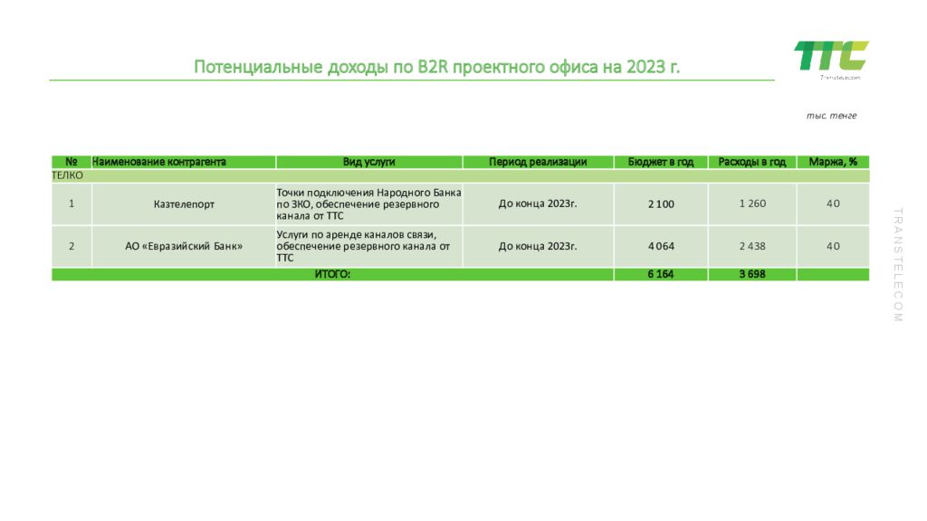 T R A N S T E L E C O M Потенциальные доходы по B2R проектного офиса на 2023 г. тыс. тенге № Наименование контрагента Вид услуги Период реализации Бюджет в год Расходы в год Маржа, % ТЕЛКО 1 Казтелепорт Точки подключения Народного Банка по ЗКО, обеспечение резервного канала от ТТС До конца 2023г. 2 100 1 260 40 2 АО «Евразийский Банк» Услуги по аренде каналов связи, обеспечение резервного канала от ТТС До конца 2023г. 4 064 2 438 40 ИТОГО: 6 164 3 698