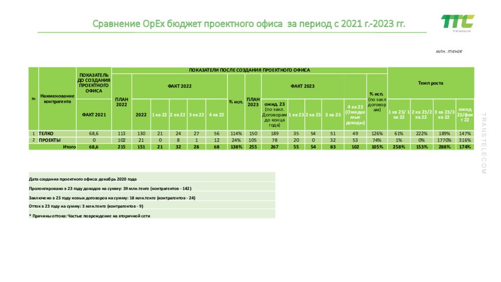 T R A N S T E L E C O M Сравнение OpEx бюджет проектного офиса за период с 2021 г.-2023 гг. млн. тенге Дата создания проектного офиса: декабрь 2020 года Пролонгировано в 23 году доходов на сумму: 3 9 млн.тенге ( контрагентов - 142 ) Заключено в 23 году новых договоров на сумму: 1 8 млн.тенге ( контрагентов - 24 ) Отток в 23 году на сумму: 3 млн.тенге (контрагентов - 9 ) * Причины оттока: Частые повреждение на вторичной сети № Наименование контрагента ПОКАЗАТЕЛЬ ДО СОЗДАНИЯ ПРОЕКТНОГО ОФИСА ПОКАЗАТЕЛИ ПОСЛЕ СОЗДАНИЯ ПРОЕКТНОГО ОФИСА Темп роста ПЛАН 2022 ФАКТ 2022 % исп. ПЛАН 2023 ФАКТ 2023 % исп. (по закл договорам) ФАКТ 2021 2022 1 кв 22 2 кв 22 3 кв 22 4 кв 22 ожид. 23 (по закл. Договорам до конца года) 1 кв 23 2 кв 23 3 кв 23 4 кв 23 (Ожидаемые доходы) 1 кв 23/ 1 кв 22 2 кв 23/2 кв 22 3 кв 23/3 кв 22 ожид 23/факт 22 1 ТЕЛКО 68,6 113 130 21 24 27 56 114% 150 189 35 54 51 49 126% 61% 222% 189% 147% 2 ПРОЕКТЫ 0 102 21 0 8 1 12 24% 105 78 20 0 32 53 74% 1% 0% 1770% 316% Итого 68,6 215 151 21 32 28 68 138% 255 267 55 54 83 102 105% 258% 153% 288% 174%