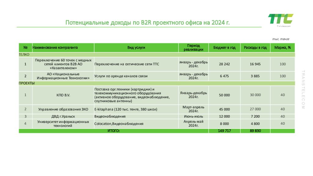 T R A N S T E L E C O M Потенциальные доходы по B2R проектного офиса на 2024 г. тыс. тенге № Наименование контрагента Вид услуги Период реализации Бюджет в год Расходы в год Маржа, % ТЕЛКО 1 Переключение 60 точек с медных сетей клиентов B2B АО «Казахтелеком» Переключение на оптические сети ТТС январь - декабрь 2024г. 28 242 16 945 100 2 АО «Национальные Информационные Технологии» Услуги по аренде каналов связи январь - декабрь 2024г. 6 475 3 885 100 ПРОЕКТЫ 1 КПО B.V. Поставка орг.техники ( картриджи ) и телекоммуникационного оборудования (активное оборудование, видеонаблюдение, спутниковые антенны) Январь-декабрь 2024г. 50 000 30 000 40 2 Управление образования ЗКО E- kitaphana (120 тыс. тенге, 380 школ) Март-апрель 2024г. 45 000 27 000 40 3 ДВД г.Уральск Видеонаблюдения Июнь-июль 12 000 7 200 40 4 Университет информационных технологий Colocation,Видеонаблюдения Апрель-май 2024г. 8 000 4 800 40 ИТОГО: 149 717 89 830