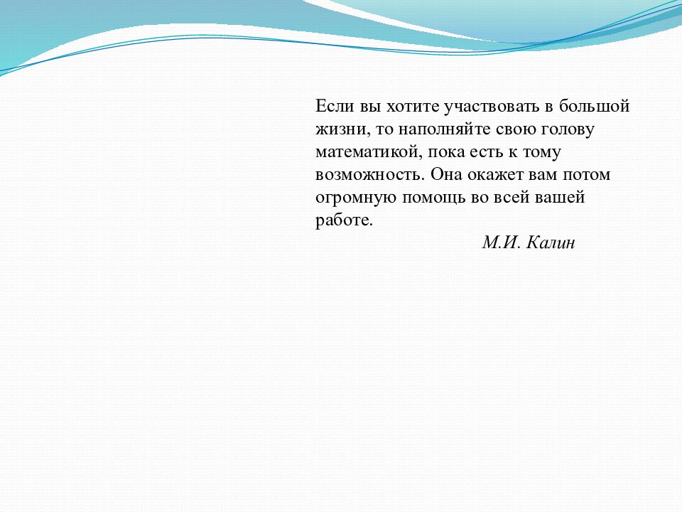 Если вы хотите участвовать в большой жизни, то наполняйте свою голову математикой, пока есть к тому возможность. Она окажет вам потом огромную помощь во всей вашей работе. М.И. Калин