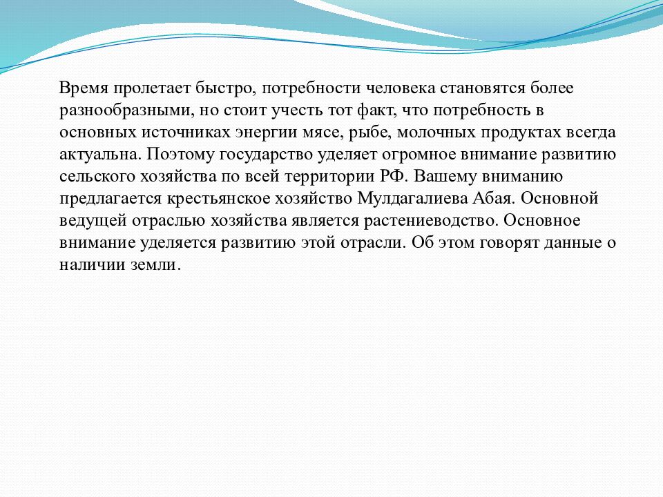 Время пролетает быстро, потребности человека становятся более разнообразными, но стоит учесть тот факт, что потребность в основных источниках энергии мясе, рыбе, молочных продуктах всегда актуальна. Поэтому государство уделяет огромное внимание развитию сельского хозяйства по всей территории РФ. Вашему вниманию предлагается крестьянское хозяйство Мулдагалиева Абая. Основной ведущей отраслью хозяйства является растениеводство. Основное внимание уделяется развитию этой отрасли. Об этом говорят данные о наличии земли.