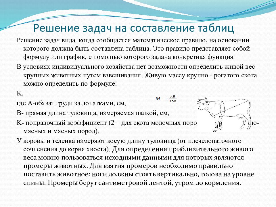 Решение задач вида, когда сообщается математическое правило, на основании которого должна быть составлена таблица. Это правило представляет собой формулу или график, с помощью которого задана конкретная функция. В условиях индивидуального хозяйства нет возможности определить живой вес крупных животных путем взвешивания. Живую массу крупно - рогатого скота можно определить по формуле: K, где A-обхват груди за лопатками, см, B- прямая длина туловища, измеряемая палкой, см, K- поправочный коэффициент (2 – для скота молочных пород, 2,5 – для молочно-мясных и мясных пород). У коровы и теленка измеряют косую длину туловища (от плечелопаточного сочленения до корня хвоста). Для определения приблизительного живого веса можно пользоваться исходными данными для которых являются промеры животных. Для взятия промеров необходимо правильно поставить животное: ноги должны стоять вертикально, голова на уровне спины. Промеры берут сантиметровой лентой, утром до кормления.