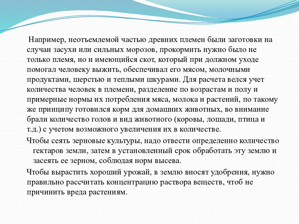 Например, неотъемлемой частью древних племен были заготовки на случаи засухи или сильных морозов, прокормить нужно было не только племя, но и имеющийся скот, который при должном уходе помогал человеку выжить, обеспечивал его мясом, молочными продуктами, шерстью и теплыми шкурами. Для расчета велся учет количества человек в племени, разделение по возрастам и полу и примерные нормы их потребления мяса, молока и растений, по такому же принципу готовился корм для домашних животных, во внимание брали количество голов и вид животного (коровы, лошади, птица и т.д.) с учетом возможного увеличения их в количестве. Чтобы сеять зерновые культуры, надо отвести определенно количество гектаров земли, затем в установленный срок обработать эту землю и засеять ее зерном, соблюдая норм высева. Чтобы вырастить хороший урожай, в землю вносят удобрения, нужно правильно рассчитать концентрацию раствора веществ, чтоб не причинить вреда растениям.